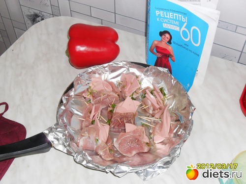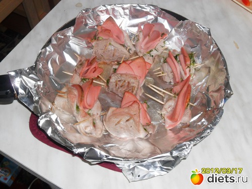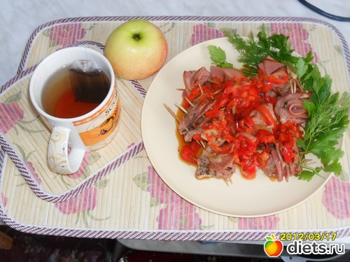 Обед: свиные рулеты с колбасой, чай без сахара, яблоко. Рулетики по книге миримановой, очень вкусные, даю рецепт.. слюни бежали, еле 12 часов дождалась..