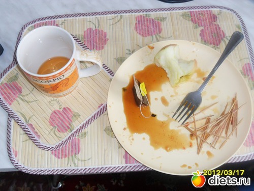 Завтрак как обычно: овсяная каша, чай с сахаром, яблоко,2 ломтика колбасы, а.. еще я мороженое скушала большой рожок, муж вчера принес мне, чтобы утром себя порадовала;