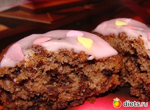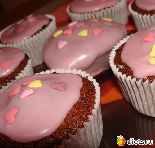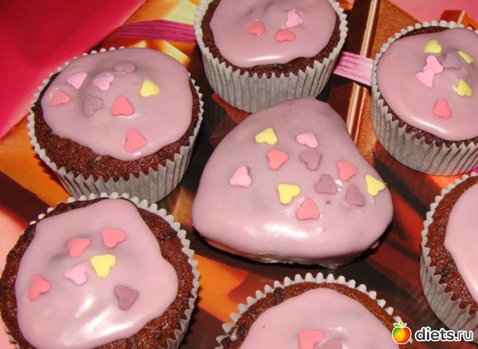 Готовые кексики вынимаем из духовки, немного остужаем и поливаем заливкой. Кексики должны быть теплыми, тогда заливка ложится ровнее.