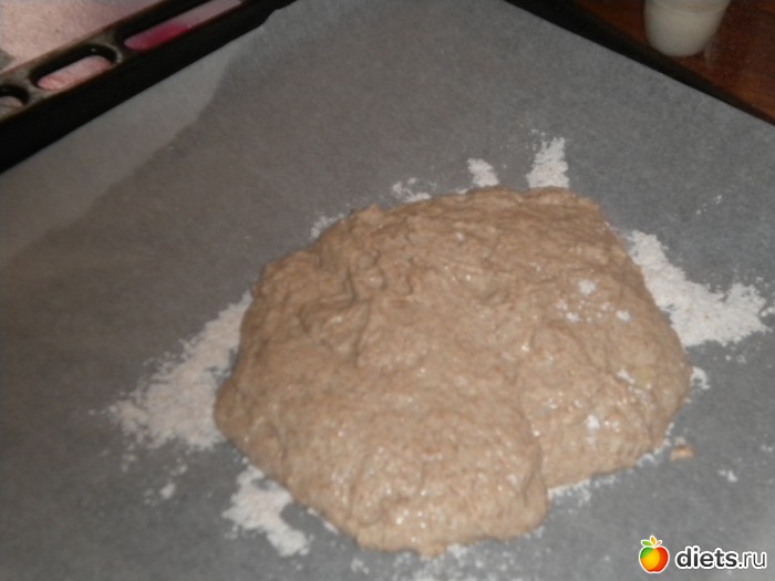 На противень постелить бумагу для выпечки и посыпать мукой. Вывалить тесто. Края теста поднять к центру.