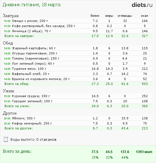 Вообщем, ничего нового пока, опять у меня жиры и белка че-то мало. Ну зато уже без кафешек и т. д. (=