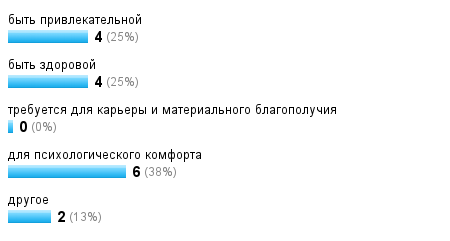 И вот, через неделю рождественских каникул, я вернулась к своему прежнему весу. Жаль потраченных впустую усилий. Но я не собираюсь все бросать, буду делать выводы из получившегося результата. Здесь на сайте прочитала статью про мотивацию и задумалась. Оказывается мотивации у меня нет никакой вообще. Комфортно мне в моем теле, но я его стесняюсь. Но похудеть то я хочу. Пытаюсь выработать правильную мотивацию. Пока единственная - это здоровье, чтоб легче было двигаться (но есть машина и лифт), чтоб дольше прожить ( не факт, несчастные случаи никто не отменял), чтоб не болели ноги (болят они у меня периодически, а не постоянно). Не хочу быть теткой, хочу быть молодой (но время неумолимо). На каждый пункт мотивации находится свое оправдание. Как найти правильную мотивацию? Какая она у вас? Для чего вы хотите похудеть?