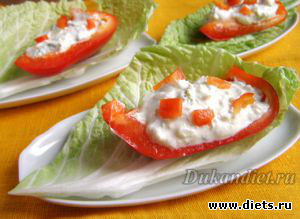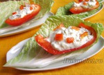 Готовим смесь из жидкого творожка, тертого корнишона, прессованной дольки чеснока, 1/3 ч. л. лимонной цедры. Половинку перца нарезаем лодочками, выкладываем начинку и украшаем сверху кусочками перца. Готовые лодочки можно уложить на листики пекинской капусты.