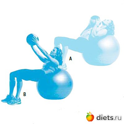 Исходное положение - лёжа на мяче, колени согнуты под прямым углом, стопы вместе, голова расслаблена, мяч лежит на груди. На выдохе выпрямляй руки и тянись к потолку, напрягая пресс. Вернись в исходное положение. Повторить 12-15 раз.