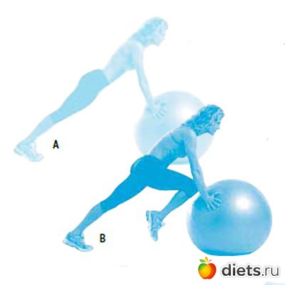Исходное положение - планка, руки на ширине плеч упираются в мяч. Тело должно быть прямым, а живот втянутым - поясница не должна прогибаться. Подтяни правое колено к груди, задержись в этом положении на мгновение и вернись в и. п. То же самое сделай с другой ногой. Это один повтор. Всего нужно сделать 12-15 раз.