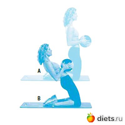 Исходное положение - стоя на коленях, спина прямая, чуть ниже уровня груди держим мед. мяч или гантели. Медленно опускайся назад - так далеко, как сможешь, не теряя прямой спины. Задержись в таком положении 3 секунды и медленно вернись в и. п. Повтори 12-15 раз.