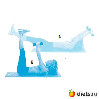 Исходное положение - лёжа на спине, с гантелями за головой, ноги прямые и не касаются пола. Подними руки и плечи к потолку, одновременно с ногами, до прямого угла. Вернись в и. п. (ноги на пол не опускать!). Повторить 12-15 раз.