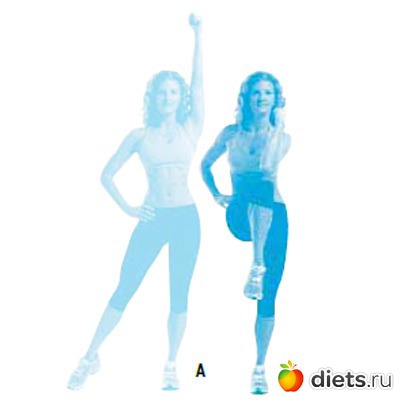 Исходное положение - стоя на полу, правая рука тянется к потолку, а левая нога отставлена чуть в сторону. По диагонали подтяни руку к колену, а колено к локтю, напрягая пресс. Повтори 12-15 раз, и сделай то же самое на другую сторону.