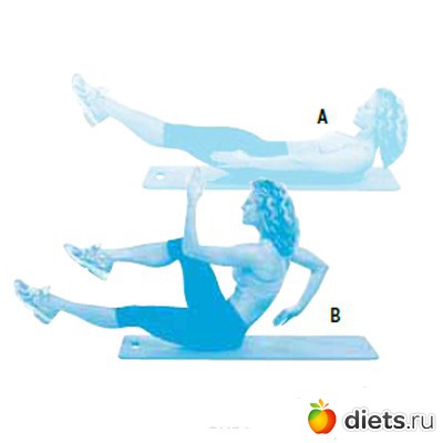 Исходное положение - лёжа на полу, плечи и ноги подняты от пола, руки вытянуты вдоль тела, живот втянут. Поднимая корпус и переходя в положение сидя, подтяни правую ногу к груди, а левую руку согни и подними, как будто ты бежишь. Медленно вернись в и. п. и повтори то же самое с другой стороны. Это один. Сделай это упражнение 10-12 раз.