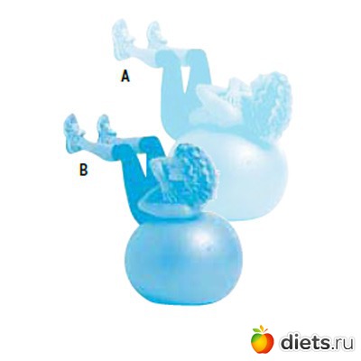 Исходное положение - лёжа на мяче, упрись ногами в стену, чтобы колени образовали прямой угол, а руки скрести на груди. Приподними плечи и скрути корпус влево. Вернись в и. п. и повтори упражнение в правую сторону. Всего 10-12 раз.