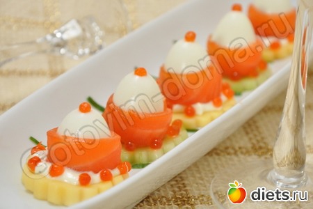 Яйца обернуть тонким, ломтиком форели или семги. Сверху, в яйцах сделать маленькое отверстие при помощи ножа (или отщипнуть кусочек верхушки пинцетом). В отверстия вложить по икринке. На кружки сыра и огурца выдавить немного крем-сыра из кондитерского мешка (если нет кондитерского мешка, можно положить немного крем-сыра при помощи чайной ложечки). Установить в центр кружка яйцо и, по-желанию, украсить закуску икринками.