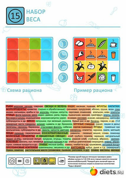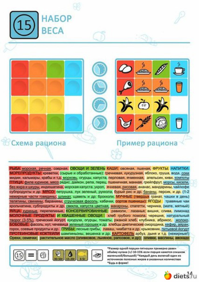 Если вы склонны легко набирать вес, то небольшая прибавка в калориях даст плавный набор веса без рисков набрать избыточный жир. Одна дополнительная порция комплексных углеводов, более калорийные продукты, молоко, соки в качестве напитков — и вес удастся сдвинуть. Умеренный профицит калорий в сочетании с грамотно построенным силовым тренингом позволит вам набирать вес плавно и преимущественно за счет мышц. Хорошая прибавка веса составляет 0,5 кг в 2-3 недели, более быстрый набор грозит прибавкой нежелательного количества жира. Отрегулировать скорость набора можно чередуя схему для набора веса в дни тренировок и сбалансированную схему в дни отдыха.