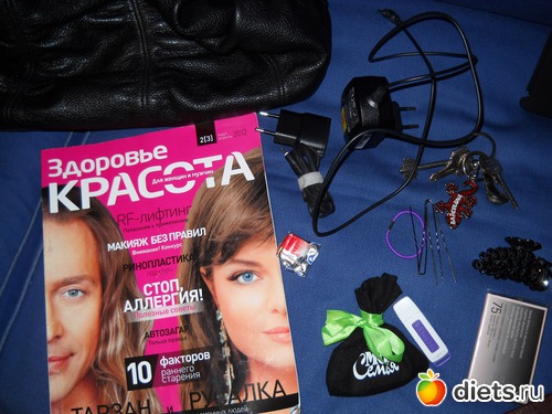 Журнал в тему, зарядки для телефона и планшета, две флешки, ключи, жевачка.