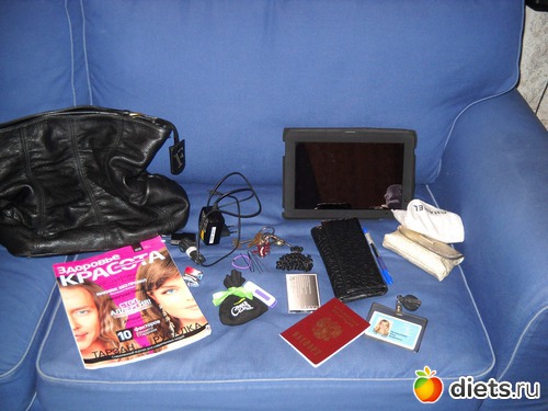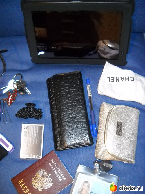Рассмотрим поближе: планшетник, кошелек, в мешочке шанель плеер, косметичка, пропуск, паспорт, заколка, салфетки матирующие)))