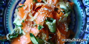 Яркие цвета и вкусы отличают также и сочетание свежего огурца и моркови. С помощью обычной овощечистки можно придать привычным овощам новую сущность. Салат из моркови, в отличие от предыдущего, готовится за минуты.