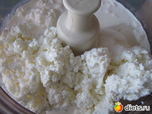В комбайн загружаем творог, сливки и сахар. Можно даже заменить сливки йогуртом без добавок, количество сахара тоже на Ваше усмотрение.