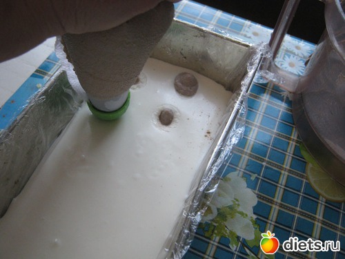 После этого берём удобное блюдо, переворачиваем десерт, снимаем плёнку.