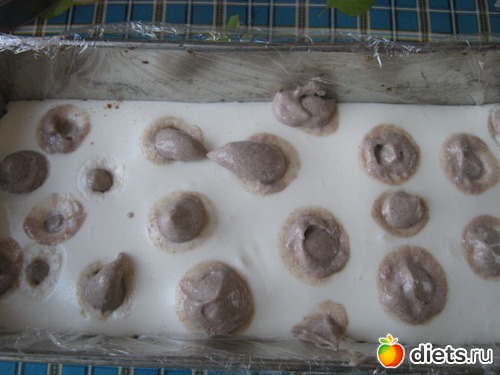 Шоколадную творожную смесь накладываем в кулинарный шприц. И начинаем шоколадной творожной смесью делать "инъекции" в белую творожную смесь.