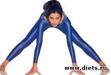 - Встаньте прямо. Ноги расставить как можно шире (лучше прыжком). Наклонитесь вперед. Руки свободно висят, если сможете, то коснитесь ими пола. Ягодицы тяните назад, пока не почувствуете напряжение мышц.