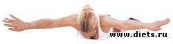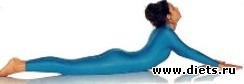 - Лягте на живот. Ноги вместе, руки вытянуть вперед, медленно поднимите подбородок, затем плечи и грудь. ТЯНИТЕСЬ ВВЕРХ. Живот касается пола.