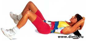 - лежи на спине ноги согнуть в коленях и упереться в пол, руки скрестить за головой (ладошка касается противоположного плеча) и приподняться отрывая плечи от пола.