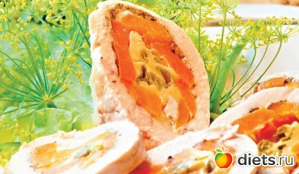 Мясо промой, разрежь пластами и слегка отбей. Посоли и поперчи. Морковь отвари, охлади и почисть. Нарежь длинной соломкой. Выложи нарезанную морковь на филе. Твердый сыр натри на крупной терке, равномерно посыпь поверх моркови. Зелень лука помой, просуши, нарежь по ширине куриного филе и выложи 2-3 луковых пера на сыр. Сверни рулет, закрепи зубочистками. Смажь растительным маслом и заверни в фольгу. Запекай при температуре 180 °С в течение часа.