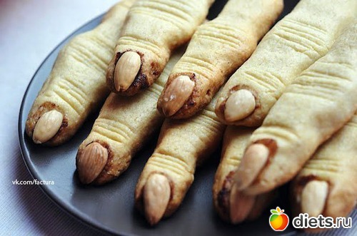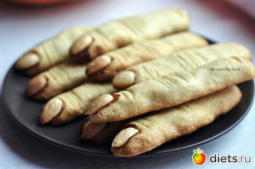 Доставать по небольшому кусочку теста, рукой на столе скатать в "колбасу". Это - основа для пальца. Придать форму пальца. Шоколад растопить, добавить немного воды и смазать место для ногтя и конец пальца. На каждый палец положить миндаль и придавить.
