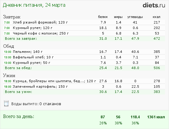 Что-то не удается мне нормально заняться питанием уже пару дней. Тренировки прямо вах-вах проходят, на совесть и по полной, но моя цель - это все-таки синтез классных тренировок и если не идеального, то хотя бы нормального питания. Вообщем, вот (без фото, я у бабушки, телефон капризничает):