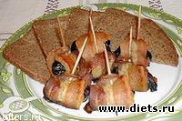 Разложите на противень приготовленные тонкие ломтики бекона. Ломтики сыра выложите поверх кусочков бекона и посыпьте все мелко нарезанной зеленью кинзы. Заверните каждую оливку в полоски сыра и бекона и скрепите зубочисткой. Поместить противень с оливками в разогретую до 250°С духовку на 10 минут. Готовые оливки выложите на блюдо и подайте к столу с гренками.
