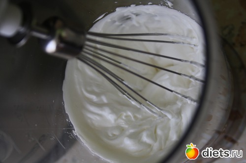 Тем временем достать из холодильника белок, добавить оставшуюся 1сл. л. сахарной пудры и взбивать до устойчивых пиков не менее 4-5 минут.