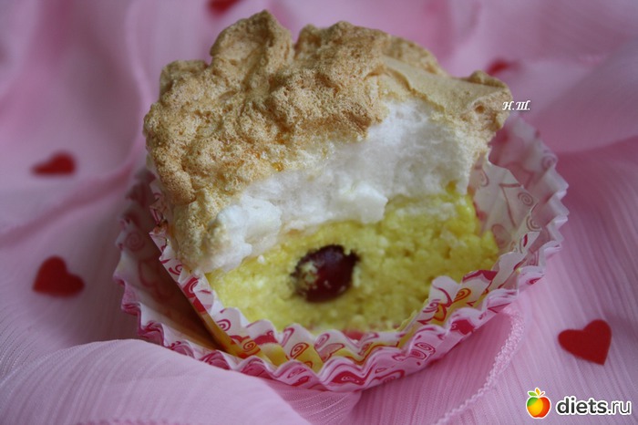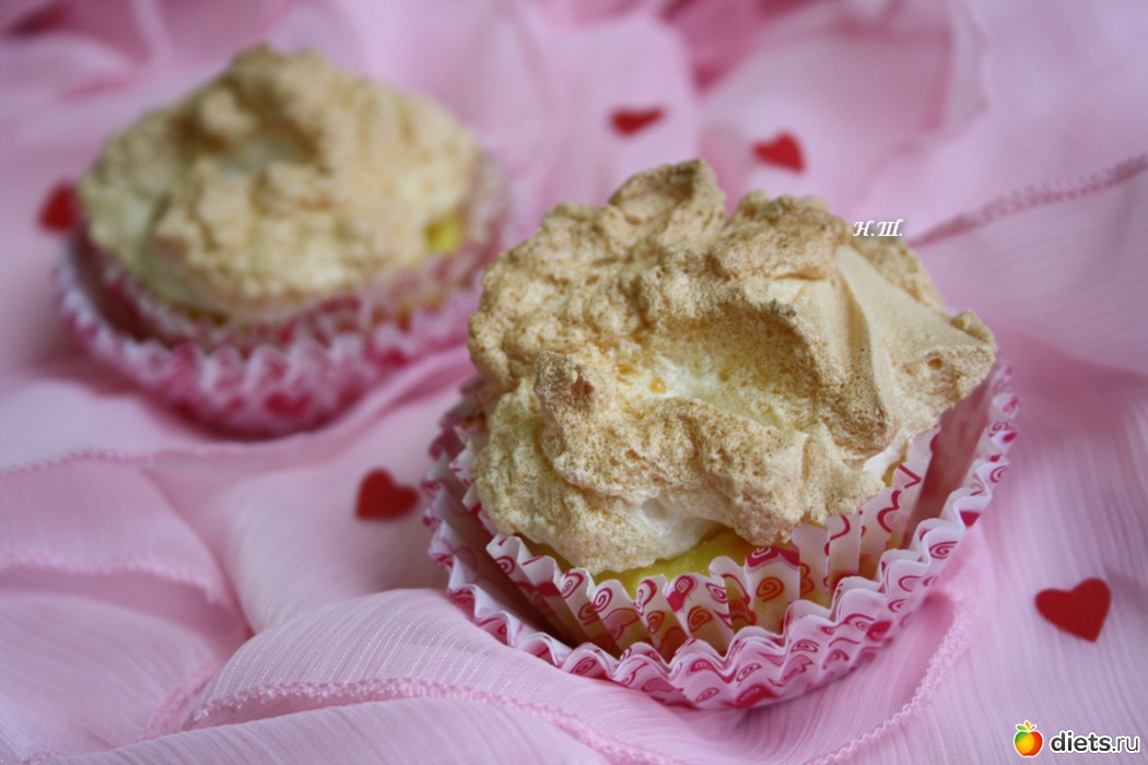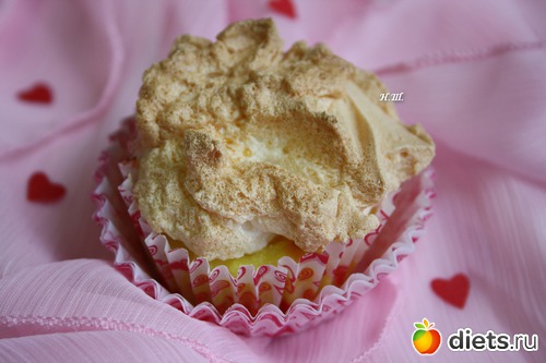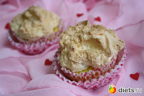 По истечении выпекания творожной массы, достать формочки из духовки. Поверх творожной массы положить по одной полной десертной ложке взбитого белка- безе. Затем опять отправить в духовку для запекания на 3-5 минут в зависимости от вашей духовки.