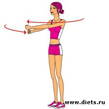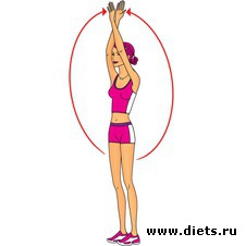 Встаньте прямо, слегка согните колени. Поднимите руки через стороны вверх и скрестите их над головой. Потом опять разведите руки в стороны. Можно выполнять упражнение с гантелями.