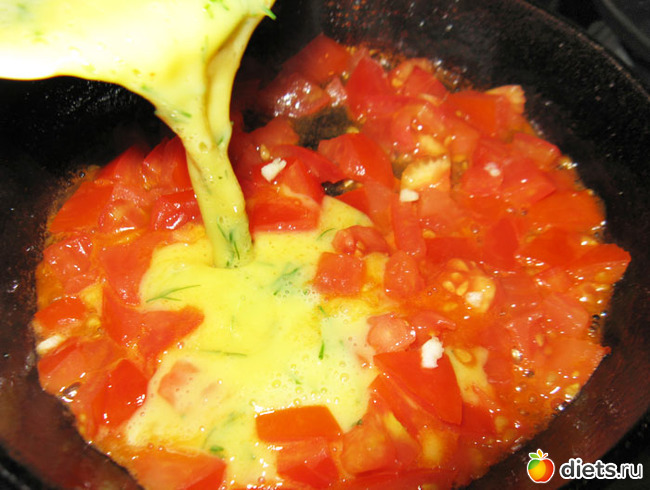 Если хотите приготовить омлет без кожуры помидоров, то непосредственно перед разрезом обдайте их кипятком и снимите кожуру.