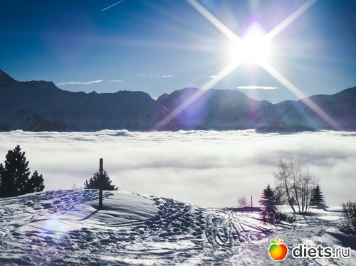 Я подобное видела раньше, но не в таких масштабах: пригорок, на горизонте горы, а от этого пригорка до гор простилается белая гладь облака, как огромное озеро! Кажется, что можно подойти к краю и нырнуть в него… А кое-где из этого белого «озера» торчат островки - крыши домов или пики гор пониже. Иногда облако немного отступало и тогда можно было увидеть «подводный мир»: городок, подъемники, катающихся лыжников (которым наверное ой как несладко было в этом облаке!))). А иногда белая волна сильнее надвигалась на «берег» и подбиралась чуть ли не к самым ногам… В общем, удивительное и непередаваемое даже на фотографии ощущение