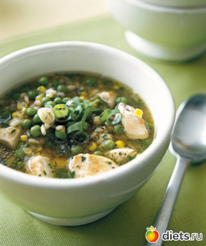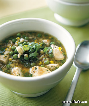 Разогрейте оливковое масло. Обжарьте сначала белую часть зеленого лука, затем куриные грудки — до образования румяной корочки. Добавьте тимьян, лавровый лист и перемешайте. Влейте бульон, засыпьте рис, доведите до кипения. Уменьшите огонь и варите под крышкой 10 минут. Опустите кукурузу, горох и подержите на плите еще 1 минуту. Приправьте солью, перцем и петрушкой. Разлейте по тарелкам, украсьте зеленым луком.