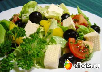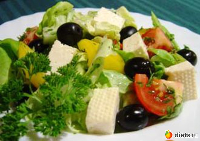 Помидоры, оливки, брынза, салатные листья, петрушка, грецкие орехи.