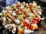 6. Смешиваем капусту, кукурузу, мелко резаный лук, болгарский перец, курицу. Укладываем на тарелку, сверху укладываем сырные шарики, крутоны, поливаем салат из пекинской капусты заправкой.