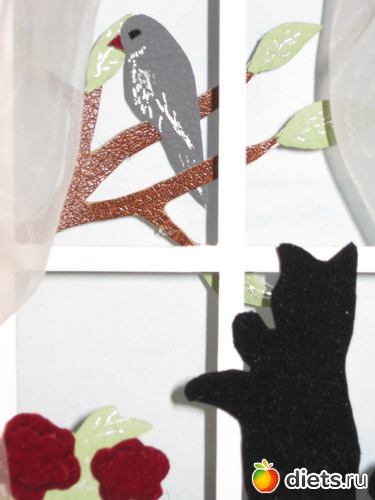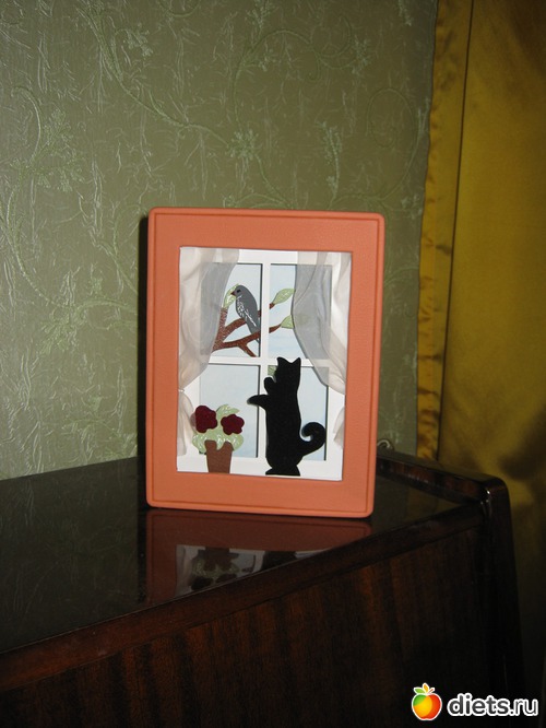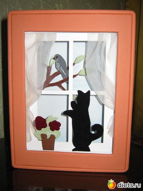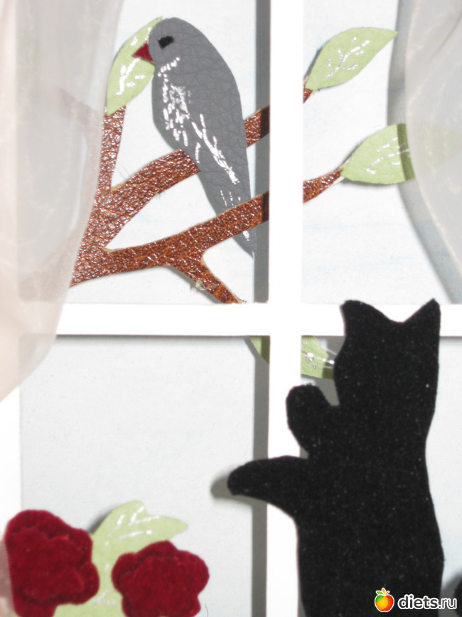 Вся работа вырезана из 2-х видов типографского картона, сам котик обклеен велюром, усики сделаны из тонкой лески, птица и дерево сделаны из