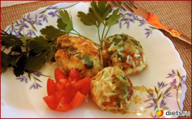 Пропускаем через мясорубку куриную грудку(либо пробиваем ее в блендере). Обжариваем мелкорубленый лук, отставляем что бы остыл. Соединяем фарш, лук, сливочный сыр, яйцо, половину рубленой петрушки. Скатываем мясные шарики, обваливаем в муки и обжариваем. Подаем с соусом.