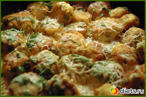 Соус влить в сковороду с шариками и "припорошить" все тертым сыром.