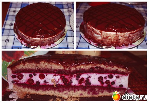 Нижний пропитанный корж поставить в разъемную форму. Выложить приготовленный крем с ягодами.