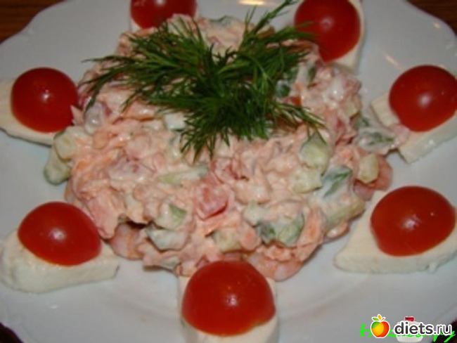 Салат с креветками и овощами Девочки, простой рецепт салата с креветками - салат айсберг, отварные креветки, яйца, помидоры и заправка по Дюкану на ваш вкус. Мне нравится такая : на 125 г баночку йогурта 1 ч ложку обычной горчицы, по вкусу сахарозаменитель и соль. Украсить блюдо по кругу кружками помидоров (с черри красивее), уложенных на кусочки сыра тоффу. Вместо салата можно свежий огурец, или и то и другое.