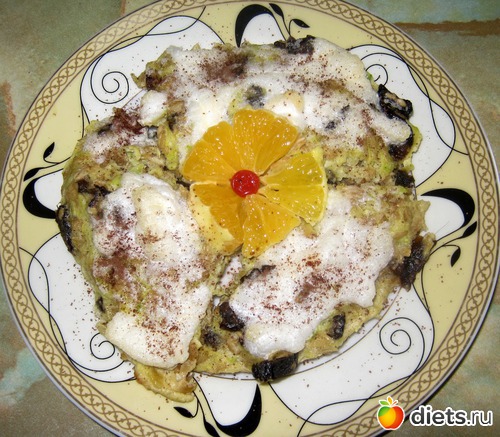 Запеканку выложить в тарелку, украсить свежими фруктами, какао.