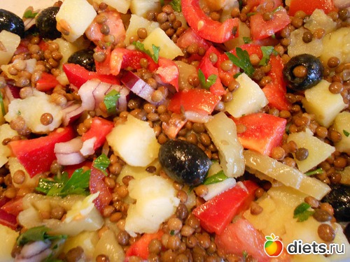 Картофель, помидор, лук режем кубиками, перчики - некрупными полосочками, чеснок измельчаем, все смешиваем с чечевицей и другими ингредиентами, заправляем - и веселенький такой салатик получается: