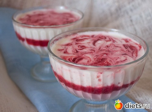 Выкладываем желе в креманки: сначала половину сметанного желе, затем сверху, очень аккуратно, клубничное. Затем снова, тоже аккуратно, сметанное. Слои немного смешаются, но это не страшно. На последний слой сметанного желе кладем по 2 ст.л. отставленного клубничного и делаем палочкой произвольные разводы.