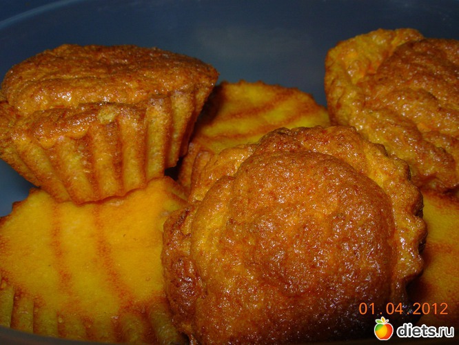 Измельчаем в блендере морковь, добавляем желтки, лимонный сок и цедру, сахарозаменитель, отруби, 1/3 взбитых белков, разрыхлитель, пряности и взбиваем в миксере.
