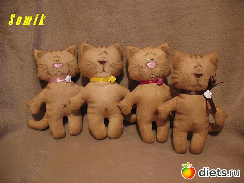 Так котик набит! Зашиваем отверстие на тельце и хвостике потайным швом (надеюсь нет необходимости показывать схему этого шва?! В случае возникновения вопроса схему можно легко найти в любом поисковике), закрепляем ниточку и прячем внутрь (я просто ввожу иголочку с ниточкой в шов, вывожу в любом месте тела, чуть натягиваю и обрезаю, хвостик прячется внутрь )