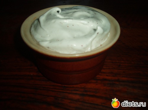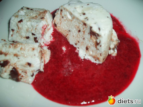 Шоколад мелко порубить. Вмешать шоколад в белковую массу. Выложить все в формочки. меня получилось 2, осталось еще пару ложек но я их съела так). Провести ножом по краям формочки.