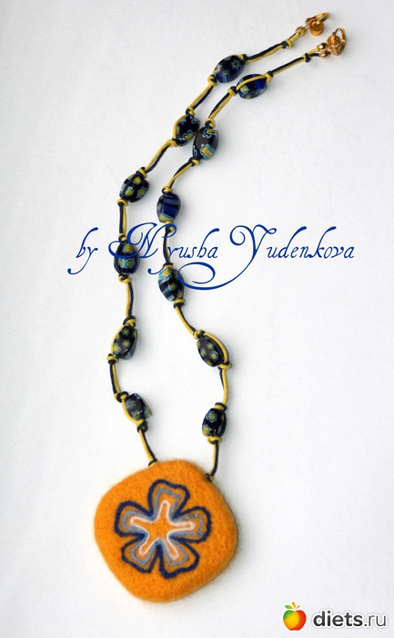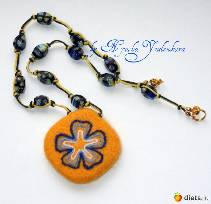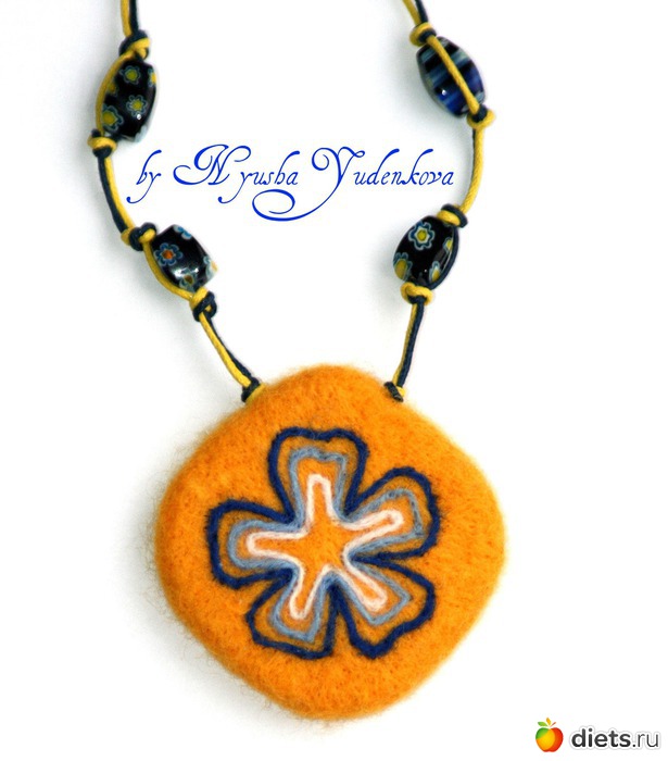 Солнечный цвет Хочу показать вам еще одну мою работу. Солнечную и цветочную. С приходом весны все больше хочется творить и создавать более яркие изделия, чтобы они украшали и были хорошим дополнением к образу. Совсем недавно я открыла для себя очень мягкий войлок, который подойдет даже тем, у кого неприязнь к шерстяным вещам, цвет выбрала насыщенный. И, конечно, сразу принялась творить (методом сухого валяния) кулон, в дополнение к нему выбрала бусины с цветочным узором, подходящим под основной рисунок войлочного кулона.