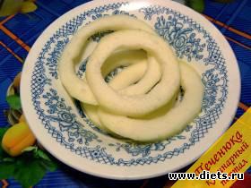 1) Очистить кабачок от твердой кожицы, удалить семена и волокна внутри кабачка, нарезать кольцами не толще одного сантиметра. Кольца посолить, потереть между ладонями, чтобы пустили сок и пропитались солью.